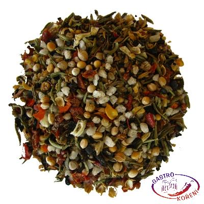 Soľ morská hrubá (max. 29%), korenie (čierne korenie, tymián, cibuľa, horčica biela, paprika, koriander).